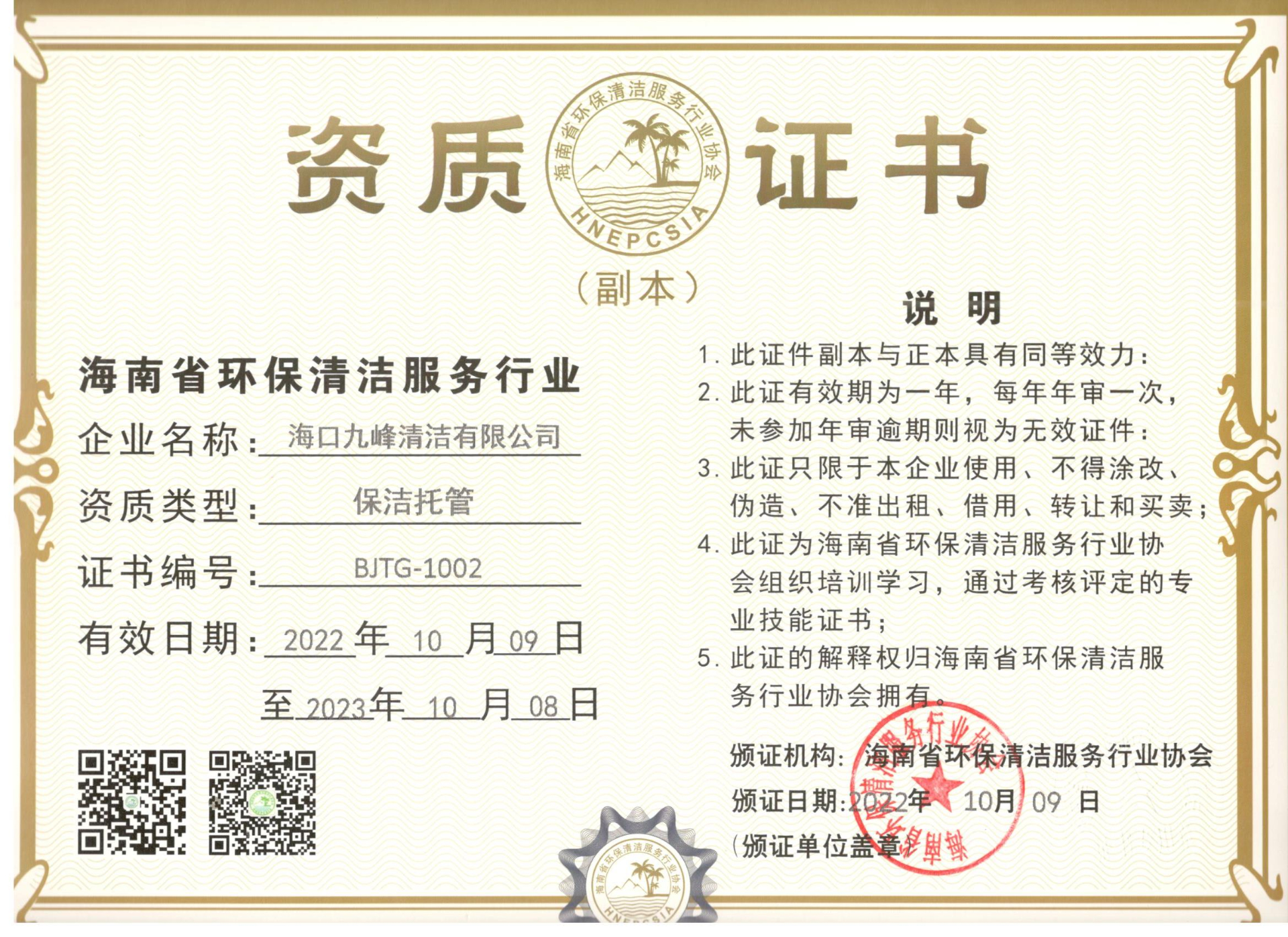 保潔托管資質(zhì)證書